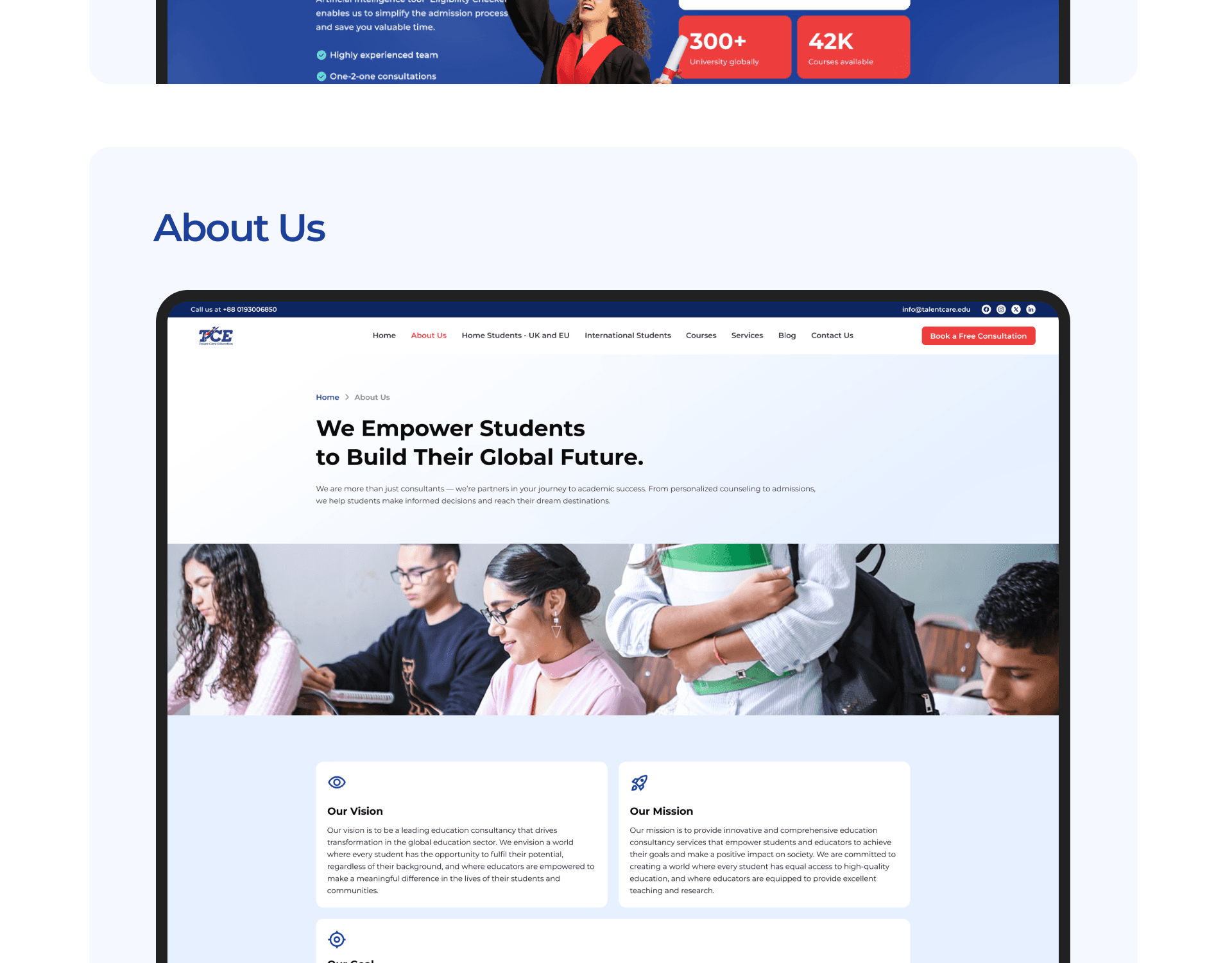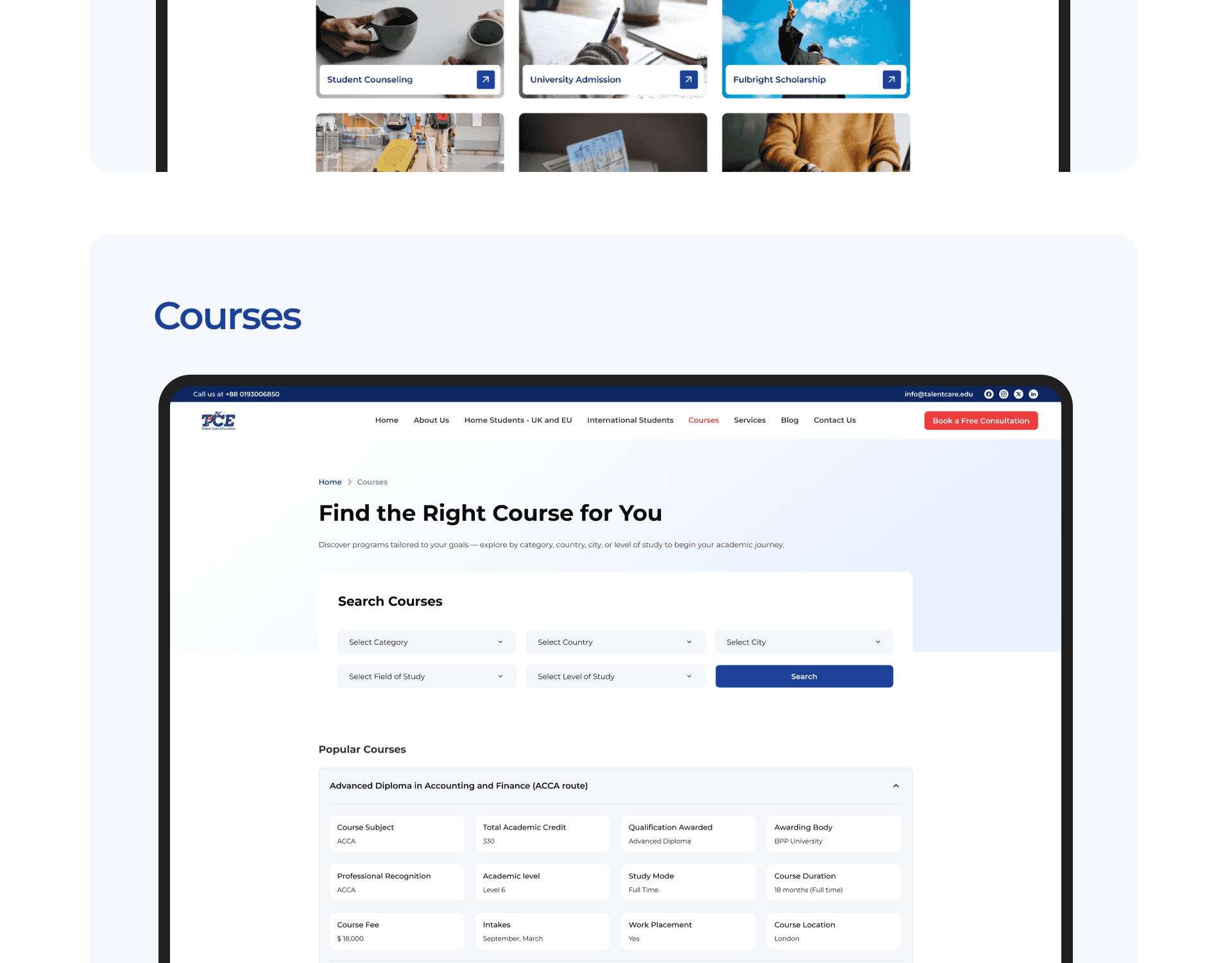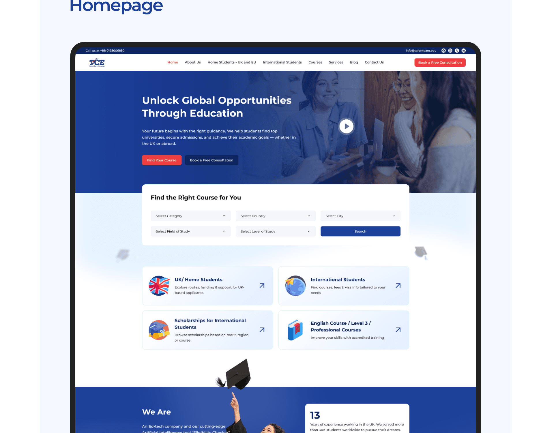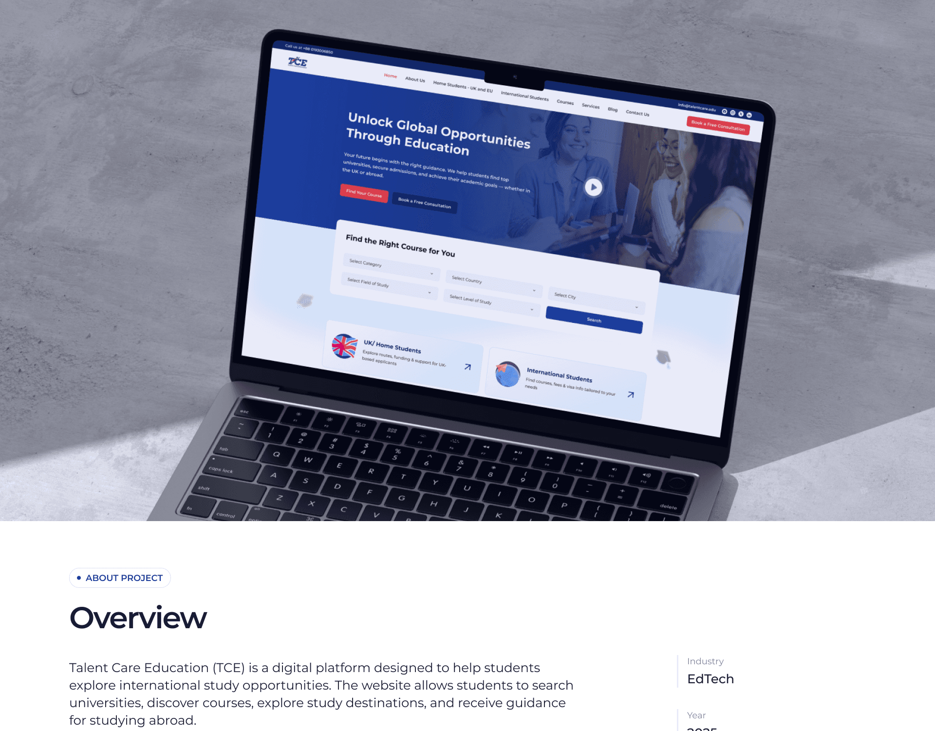 Talent Care Education (TCE) is a digital platform designed to help students explore international study opportunities. The website allows students to search universities, discover courses, explore study destinations, and receive guidance for studying abroad.